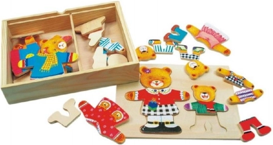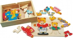 Houten aankleedpuzzel van Bino biedt zowel plezier als educatie in één praktisch pakket. Kinderen kunnen de stukken in het deksel van het doosje plaatsen en verschillende kledij voor de beren creëren volgens hun eigen fantasie.