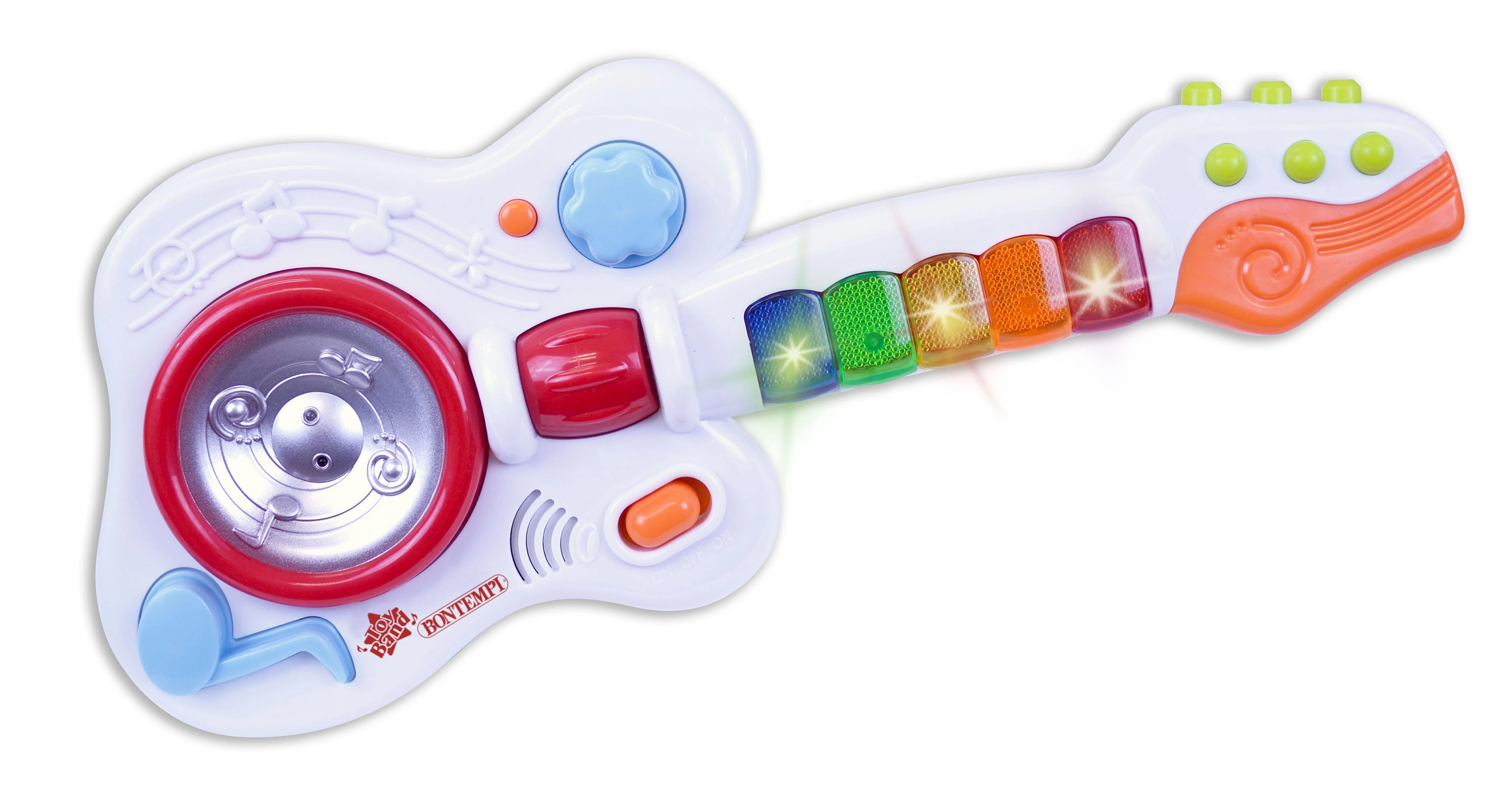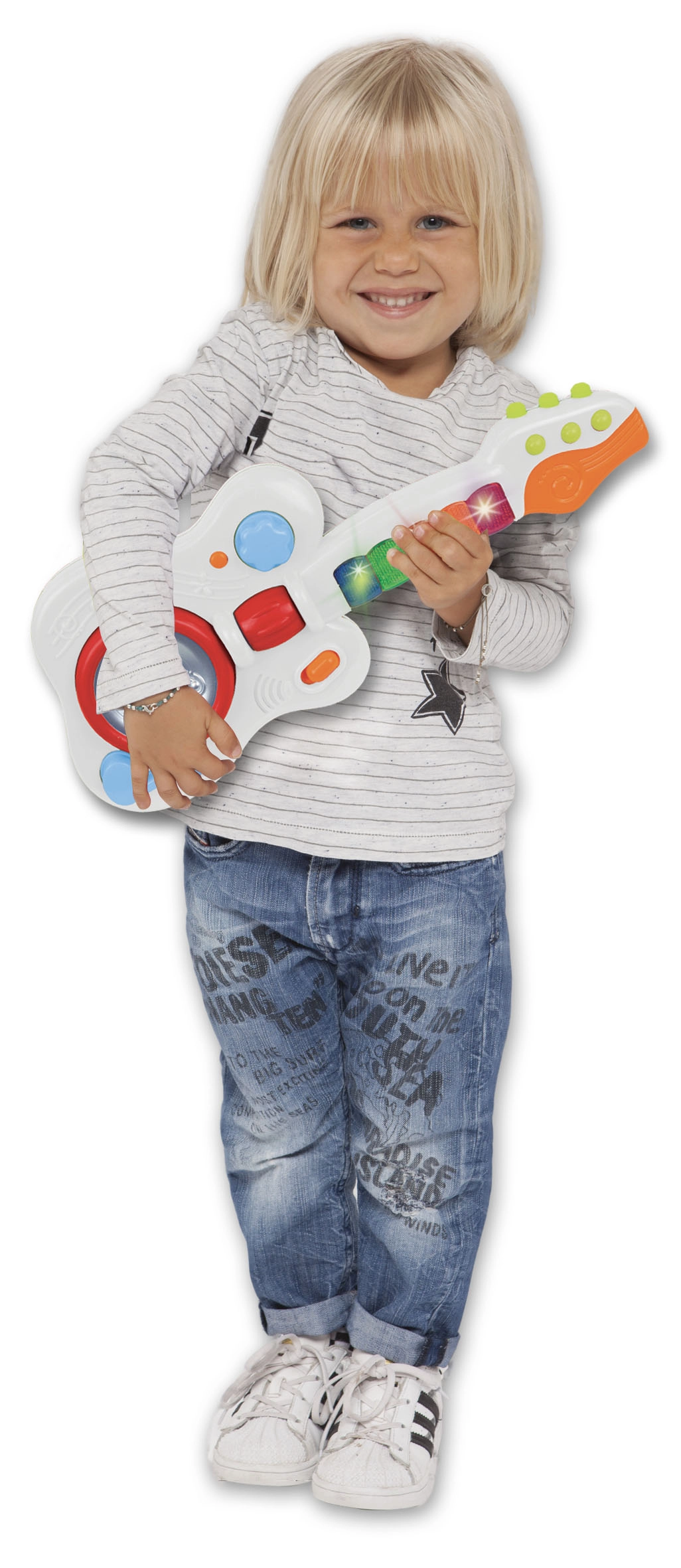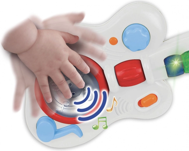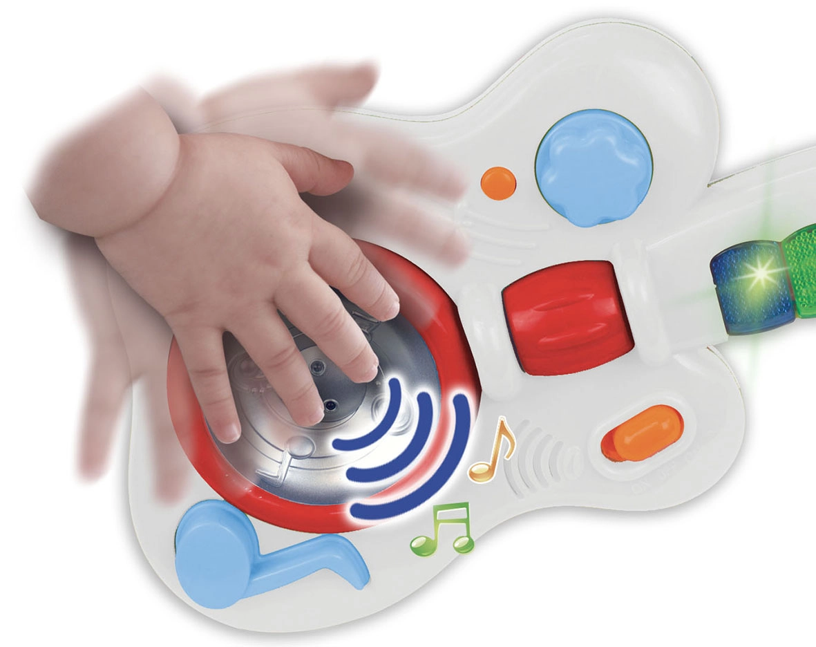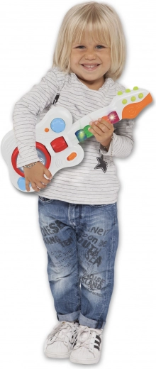 Lichteffecten zorgen voor extra plezier en energie bij elk optreden. Voeding via 3 R6 / AA 1,5V batterijen, niet inbegrepen. De gitaar is geschikt voor kinderen vanaf 1,5 jaar en heeft afmetingen van 17 x 40 x 5 cm.