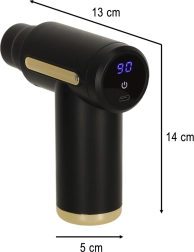 - Afmetingen massagepistool: 13 cm x 5 cm x 14 cm