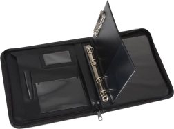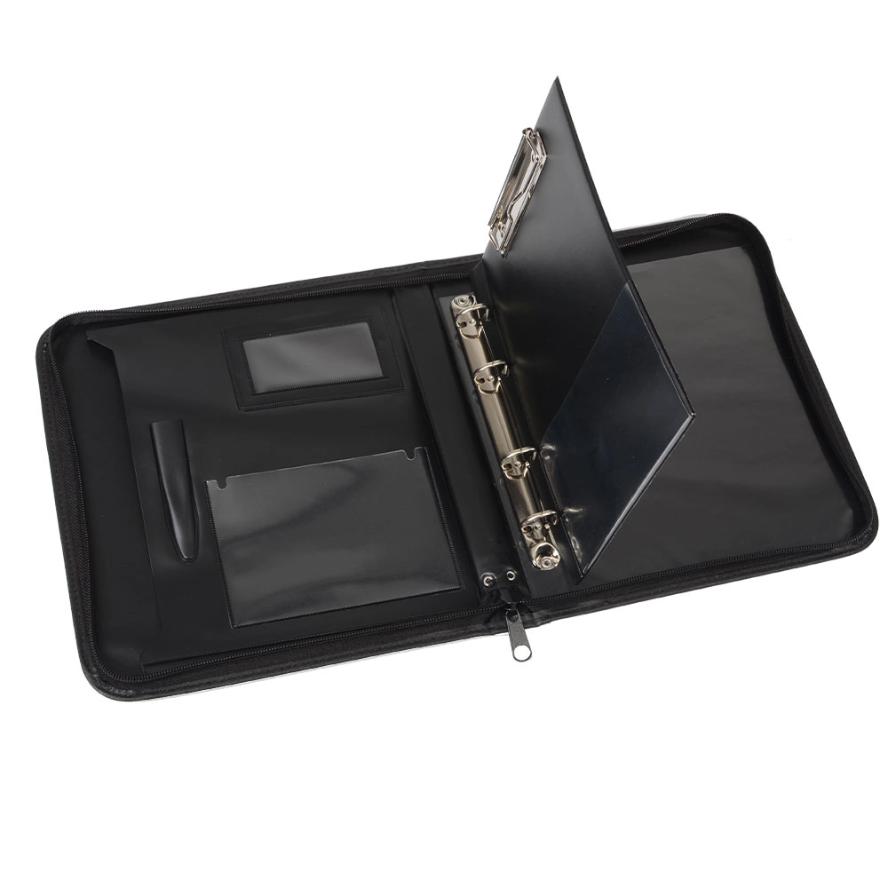 Deze stijlvolle A5-diplomatenmap in mat zwarte uitvoering houdt je materialen veilig bij elkaar dankzij de praktische rits. De indeling met vakken voor documenten en visitekaartjes en een pennenlus zorgt voor perfect overzicht en snelle toegang.