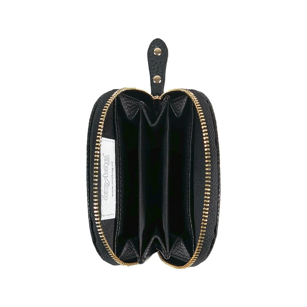 Het hoofdvak met ritssluiting houdt de inhoud veilig en dankzij de doordachte indeling heb je munten, biljetten en kaarten altijd bij de hand. De zwarte kleur past bij elke outfit en het leren oppervlak oogt elegant en tijdloos.