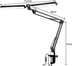 De lamp is voorzien van een dubbele lichtbron, die onafhankelijk kan worden ingesteld om twee verschillende werkplekken tegelijk te verlichten. De arm is volledig verstelbaar, wat zorgt voor hoge flexibiliteit.