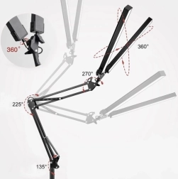 Het verstelbare armstuk maakt rotatie mogelijk in meerdere vlakken (360 / 225 / 270 / 135 graden), wat de flexibiliteit van het gebruik verhoogt. Montage is mogelijk met een klem of op een standaard, wat zorgt voor universeel gebruik in verschillende omgevingen, zowel thuis als op kantoor.