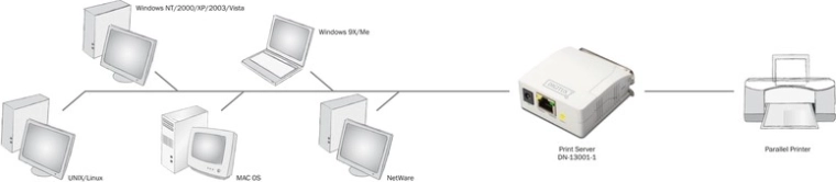 Deze Fast Ethernet server biedt een eenvoudige en efficiënte oplossing voor het omzetten van een lokale printer naar een netwerkprinter, die toegankelijk is voor alle aangesloten gebruikers. Dankzij de parallelle poort kunt u ook oudere printertypes op het netwerk aansluiten.