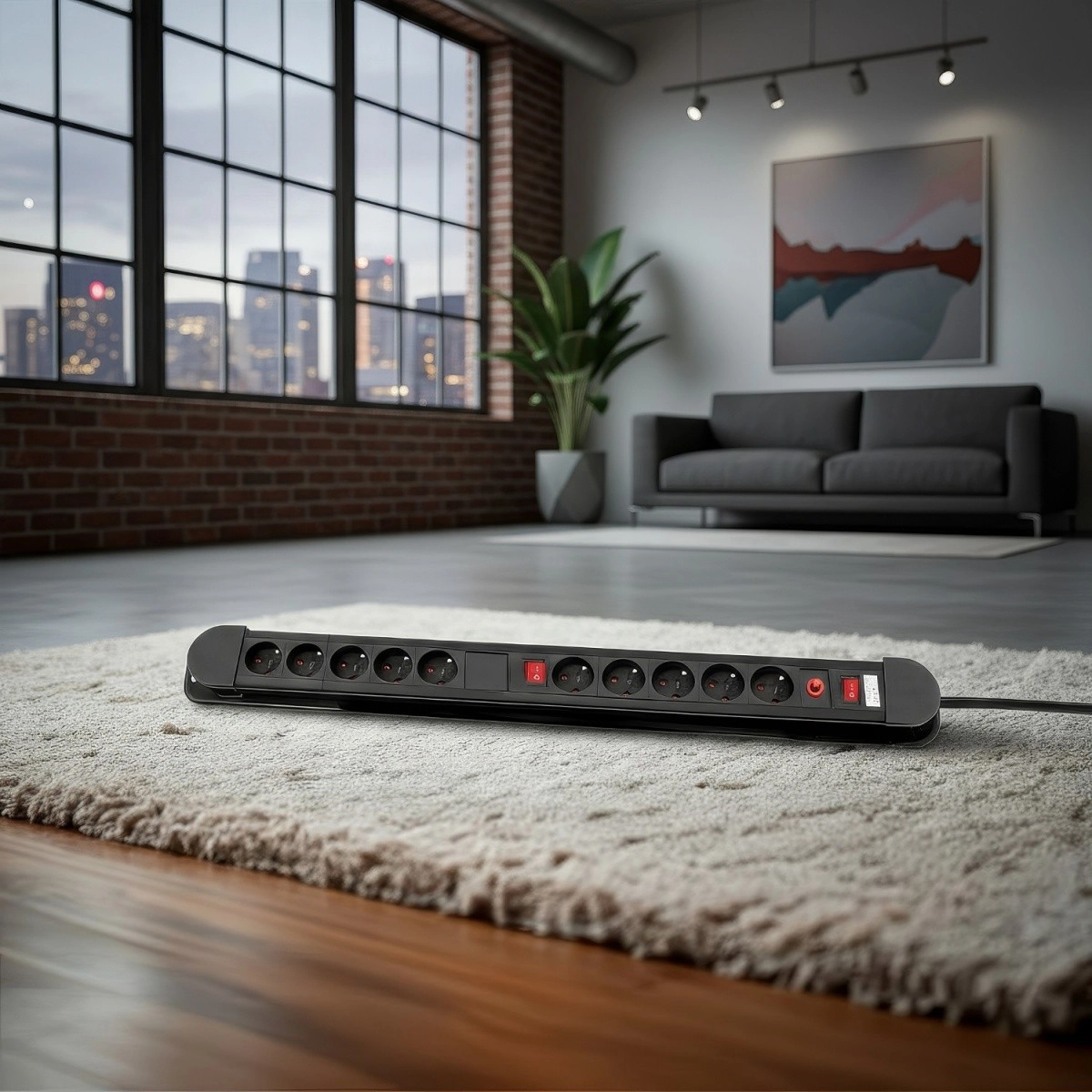 Breid de stroomvoorziening van je apparaten slim en veilig uit. Deze robuuste stekkerdoos met 10 geaarde stopcontacten biedt flexibel verbruikbeheer dankzij twee afzonderlijke schakelaars – elke helft van de stekkerdoos werkt onafhankelijk. Bescherming wordt geboden door de ingebouwde automatische zekering, die direct ingrijpt bij overbelasting of kortsluiting.