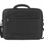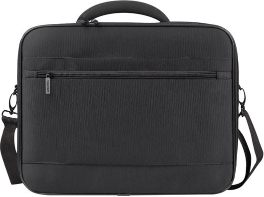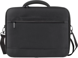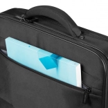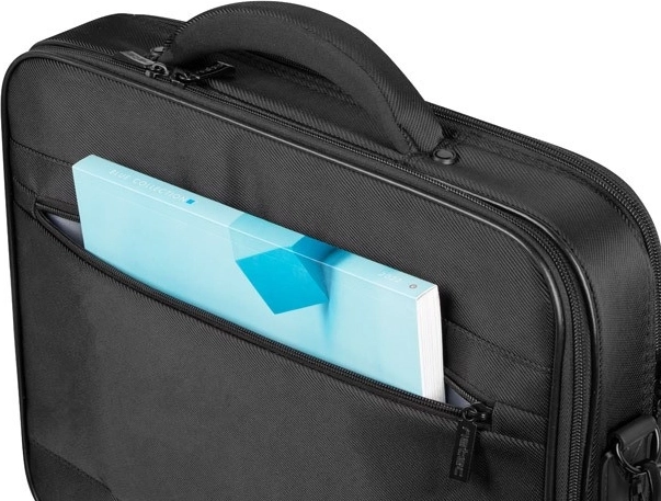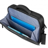De ruimte is verdeeld in drie hoofdcompartimenten – een gevoerd laptopvak, een achtervak in aktetas‑stijl voor documenten en een voorvak met organizer voor accessoires. Binnenin vind je extra ritsvakken en klittenbandvakken voor adapter, muis en kleine items, plus een verstelbare schouderriem met schouderpad voor comfort.