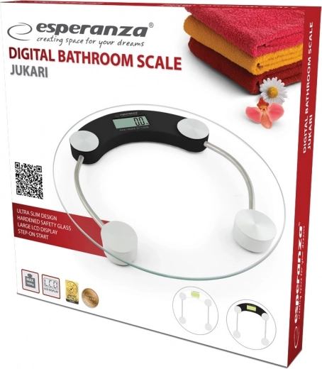 De ultradunne elektronische Jukari badkamerweegschaal is ontworpen voor iedereen die om zijn gezondheid en conditie geeft. Biedt een stijlvol design, een groot en goed afleesbaar display en eenvoudige bediening voor comfortabel dagelijks wegen.
