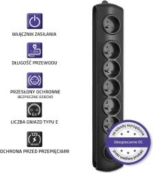 De nadruk op veiligheid wordt gewaarborgd door overspanningsbeveiliging met varistor, geïntegreerde kinderbeveiliging in alle contactdozen en onbrandbaar PP‑materiaal. Dankzij de mogelijkheid tot meubelmontage en de oplossing voor het opwikkelen van overtollige kabel houd je de bekabeling onder controle en blijft de ruimte netjes en opgeruimd.