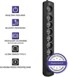 Veiligheid staat voorop: de geïntegreerde varistor beschermt tegen plotselinge spanningspieken, kinderbeveiliging voorkomt ongewenst contact en het vlamvertragende PP-materiaal verhoogt de duurzaamheid bij dagelijks gebruik. Het doordachte design in het zwart past perfect in een modern interieur, laat het overtollige snoer rond de behuizing wikkelen en biedt ook de mogelijkheid tot montage op meubels.