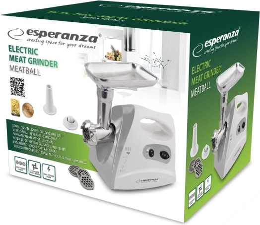 Krachtige elektrische vleesmolen ESPERANZA met een 600 W motor voor snel en efficiënt malen. Drie roestvrijstalen schijven (2,7 / 4 / 8 mm) bieden veelzijdig gebruik, met opzetstukken voor worsten en kebbe. Antislipvoetjes zorgen voor stabiele werking en de eenvoudige bediening is een aanwinst voor elke keuken.