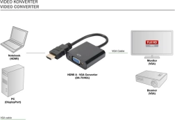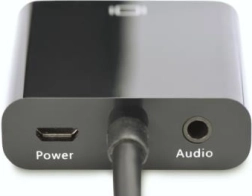 - HDMI → VGA (video), audio via 3,5 mm