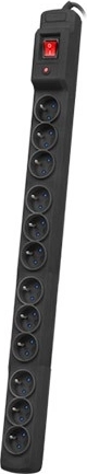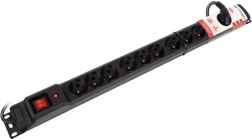 Professionele overspanningsbeveiligde stekkerdoos voor 19'' racks met 12 geaarde stopcontacten, automatische zekering en overspanningsbeveiliging. Ideaal voor verticale montage in patchkasten, vergaderruimtes en werkbanken – betrouwbare stroomverdeling met snelle controle dankzij de centrale schakelaar.