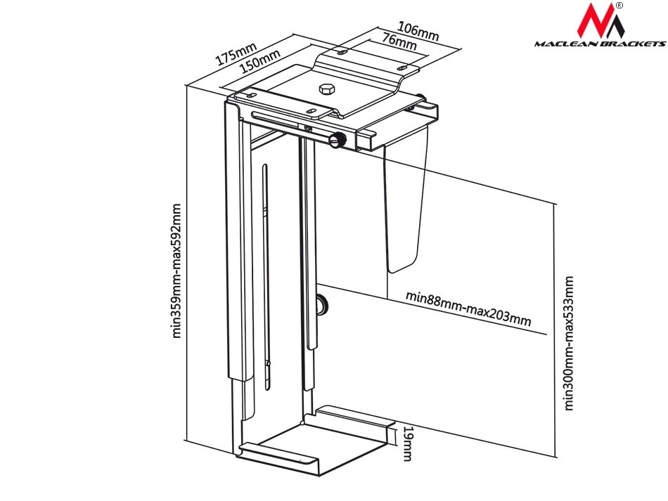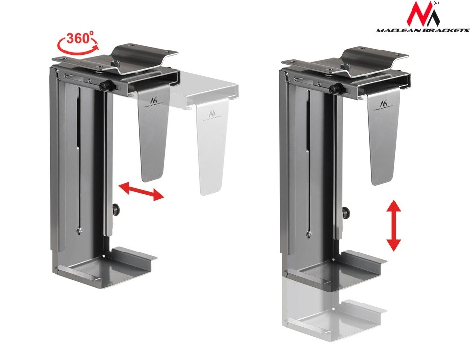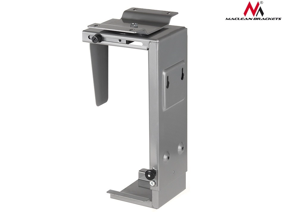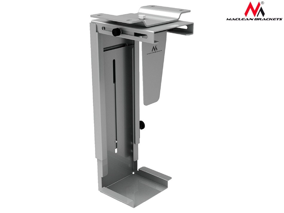 Elegante computerhouder Maclean MC-713 S maakt verticale installatie onder het bureaublad mogelijk, wat effectief ruimte bespaart en uw computer beschermt tegen stof en elektrostatische ladingen.