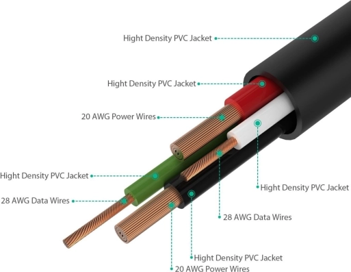 De dicht geweven mantel met meerlaagse afscherming en dikkere stroomaders zorgt voor duurzaamheid en een stabiele overdracht van data en stroom.