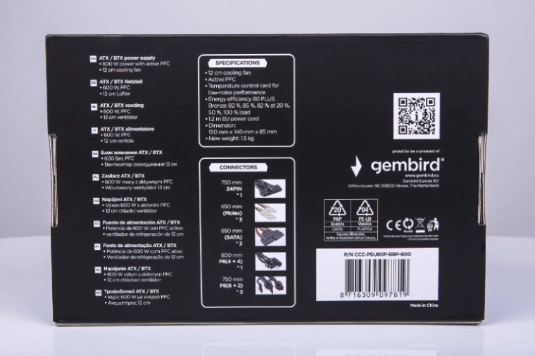 Deze ATX-voeding van 600 W is ontworpen voor betrouwbare en efficiënte werking in zowel thuis- als gaming-sets. De 80 Plus Bronze-certificering garandeert hogere efficiëntie, lagere verliezen en stillere werking. Actief PFC stabiliseert de spanning en verbetert de stroomkwaliteit voor gevoelige componenten.