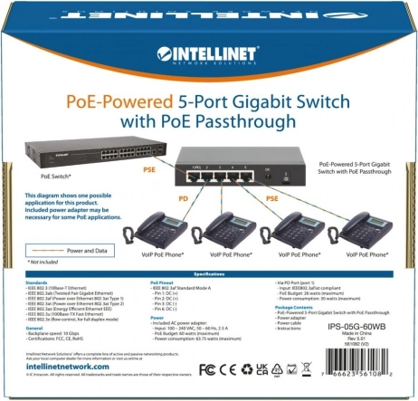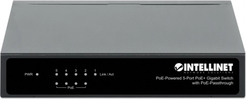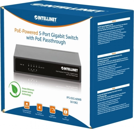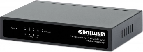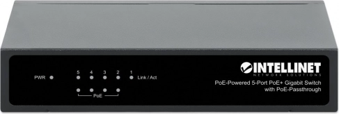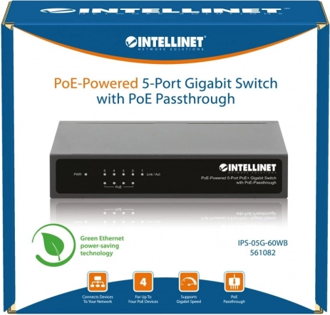Compacte 5-poorts gigabit INTELLINET-switch met PoE-passthrough voedt tot vier apparaten en werkt ofwel via PoE of met de AC-adapter. Biedt een totale PoE-budget tot 68 W, ondersteuning voor IEEE 802.3af/at, energiezuinige Green Ethernet-technologie en PoE-bereikverlenging tot 200 m.