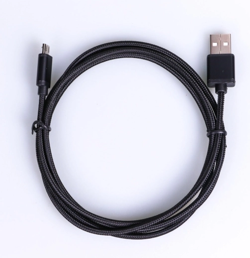Duurzame USB–micro USB-kabel van 1,5 m met een elegante zwarte textiele vlecht, een uitstekende keuze voor zowel opladen als datasynchronisatie. De USB 2.0-standaard biedt betrouwbare overdrachtssnelheden en brede compatibiliteit met computers en randapparatuur.