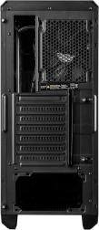 Minimalistische zwarte behuizing met een zijpaneel van gehard glas die je componenten en RGB-elementen stijlvol tentoonstelt, zonder in te leveren op functionaliteit en airflow.
