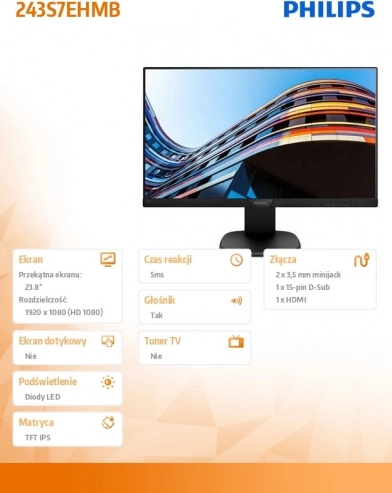 Philips-monitor met een beelddiagonaal van 23,8 inch biedt een scherp beeld dankzij IPS-technologie. Biedt flexibele aansluitmogelijkheden met HDMI en beschikt over een pivot-functie voor comfortabel draaien van het scherm. Ook geschikt voor multimedia-entertainment dankzij de geïntegreerde luidsprekers.