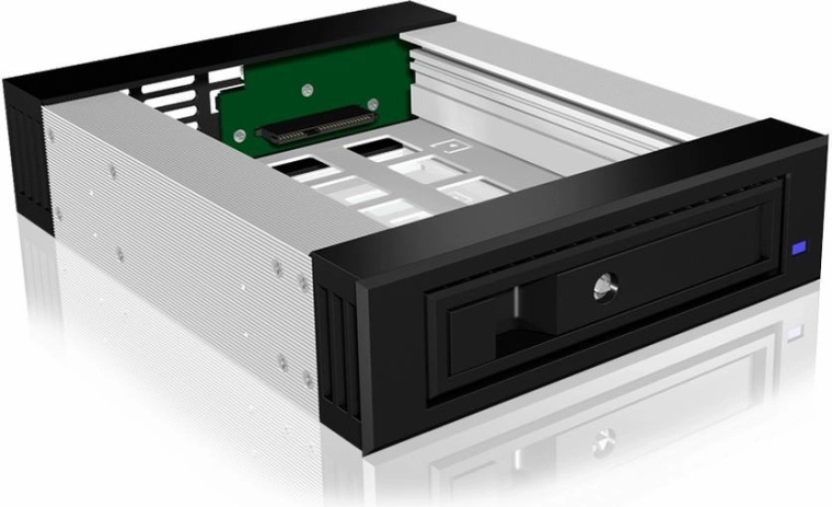 Universele hotswap-frame voor 5,25" voor 3,5"/2,5" SATA/SAS-schijven maakt snel en veilig werken met opslag mogelijk. Biedt ondersteuning voor SATA/SAS tot 6 Gb/s, gereedschapsloze installatie, aluminium behuizing met passieve koeling en slot tegen onbevoegde toegang voor een stille en betrouwbare werking.