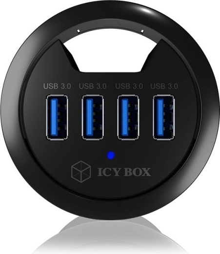 Een slimme oplossing voor het moderne bureau: de ronde USB-hub ICY BOX wordt direct in het bureaublad-doorvoergat met een diameter van 60 mm geïnstalleerd – zonder gereedschap en in een handomdraai. U krijgt comfortabele toegang tot vier USB 3.0-poorten met hoge overdrachtssnelheden tot 5 Gbit/s, zodat u eenvoudig externe schijven, sticks, toetsenborden, muizen en printers aansluit.