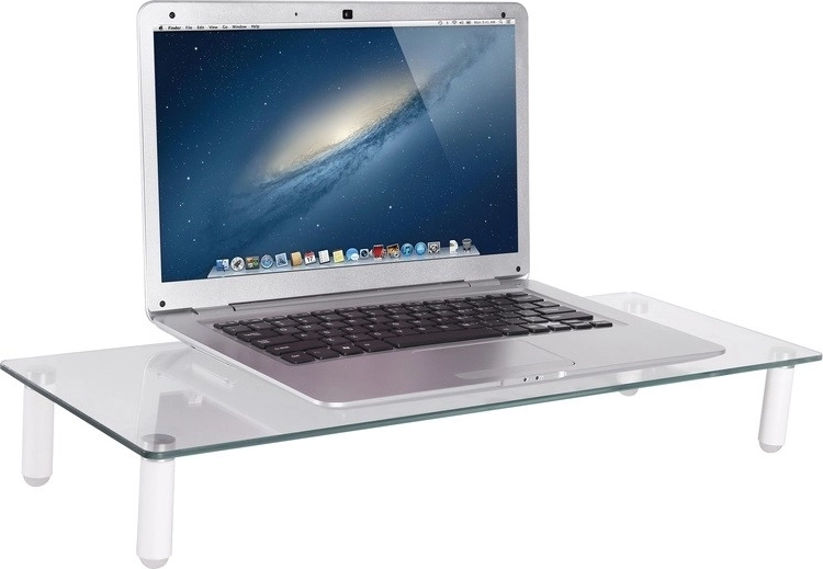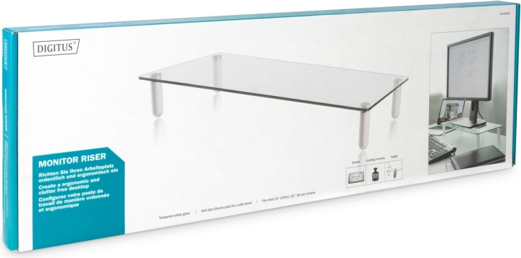 Glazen monitorstandaard stelt u in staat uw monitor in een ergonomische positie te plaatsen en tegelijkertijd meer ruimte op uw bureau te creëren. Dankzij het geharde veiligheidsglas en de antislip voetjes blijft de monitor stabiel.