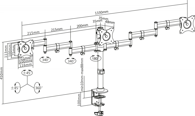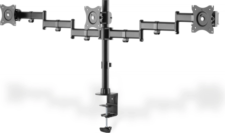 Universele standaard voor drie monitoren of televisies met montage op het bureaublad of tafel, maakt uitbreiding van de visuele werkruimte mogelijk. Heeft VESA-openingen compatibel met 75x75 en 100x100.