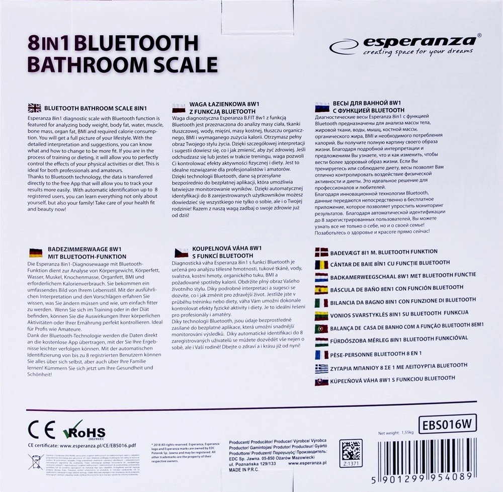 Ontdek onze innovatieve diagnostische weegschaal Esperanza “8-in-1” B.FIT, die geavanceerde BIA‑technologie (bio-elektrische impedantieanalyse) gebruikt voor een nauwkeurige meting van de lichaamssamenstelling. Parameters inclusief gezondheid in recordtijd. Gegevens worden draadloos via Bluetooth verzonden rechtstreeks naar een gebruiksvriendelijke app die helpt de resultaten te volgen en te interpreteren.