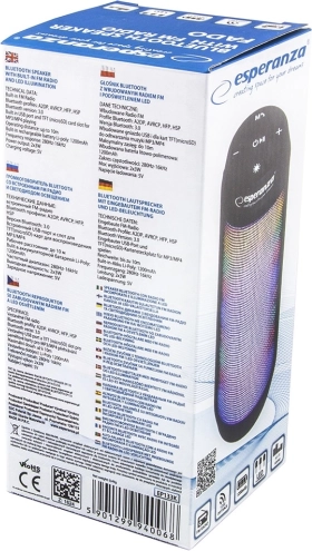 Esperanza Fado is een stijlvolle, draagbare Bluetooth-luidspreker met een 360° rooster die krachtig geluid combineert met een opvallende lichtshow. Dankzij meerdere ingangen speelt hij je playlists af vanaf telefoon, USB-stick en microSD-kaart en fungeert hij tevens als handsfree voor comfortabel bellen.