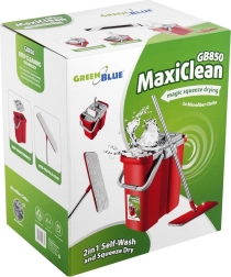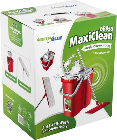 De GreenBlue MaxiClean mop combineert comfort en prestaties: de platte kop bereikt eenvoudig nauwe plekken, het elastische scharnier volgt het oppervlak en maakt schoonmaken onder laag meubilair mogelijk. Dankzij de tweekamers emmer WASH/DRY wast en wringt u zonder vuile handen en zonder onnodig spatten – vloeren blijven streeploos.