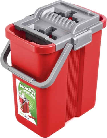 De robuuste kunststof emmer met stabiele handgreep en geïntegreerd wringmechanisme zorgt voor veilig dragen en gecontroleerd afdruipen zonder spatten.