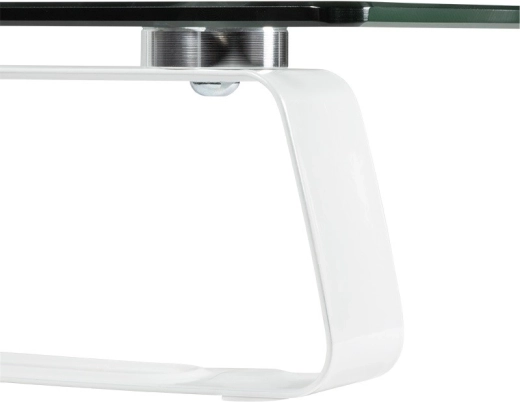 Transparant 5 mm glas met minimalistische lijnen maakt het bureau visueel lichter en creëert tegelijk ruimte onder de standaard voor een toetsenbord of documenten.