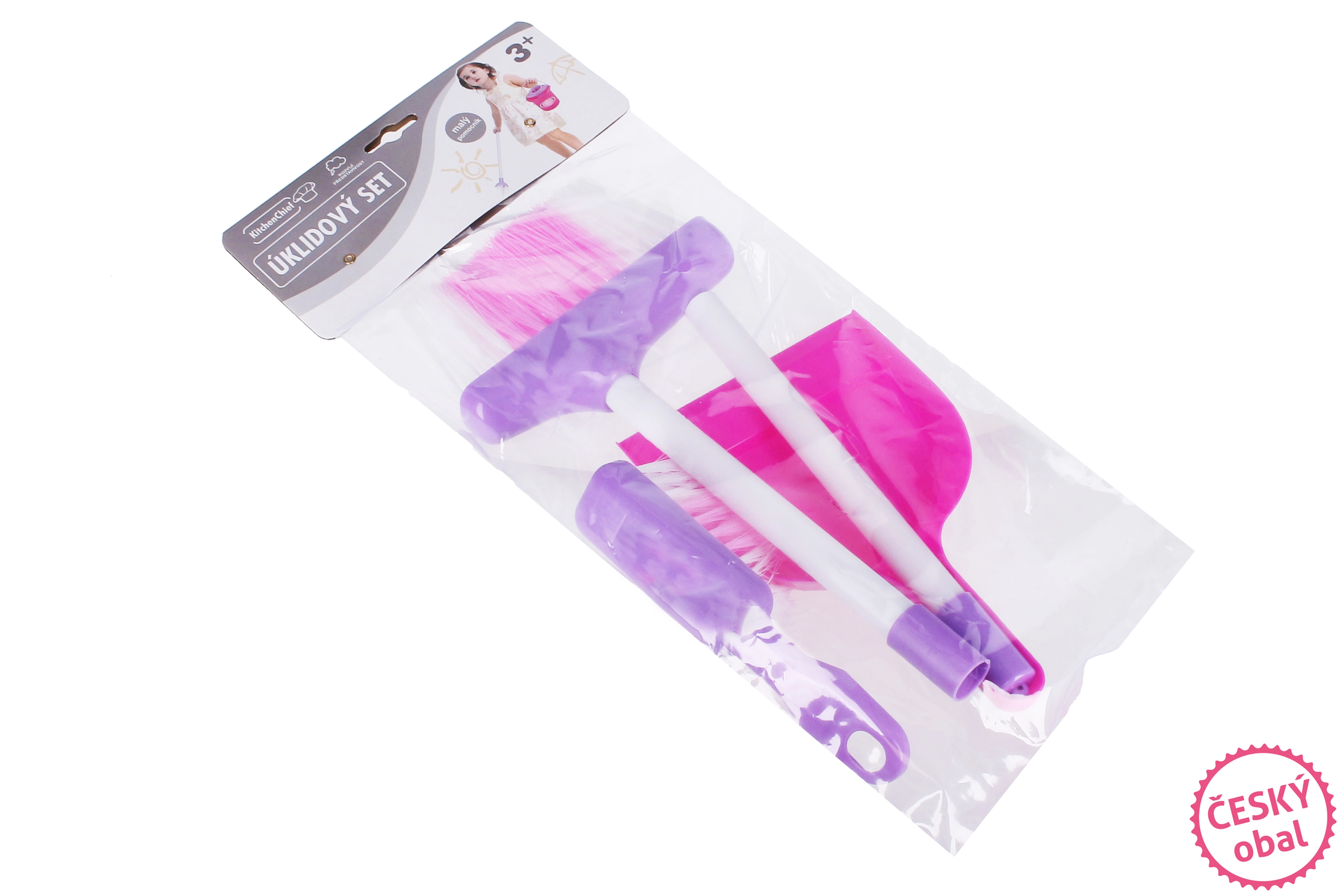 Praktische kinder schoonmaakset bestaande uit 3 delen – blik, handveger en opvouwbare bezem. Gemaakt van duurzaam plastic in roze-witte kleur, ideaal voor rollenspel in het huishouden en het ontwikkelen van de fijne motoriek. De opvouwbare bezem past gemakkelijk in een kleinere speelgoedkrat.