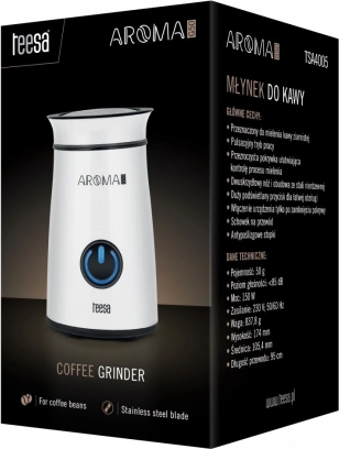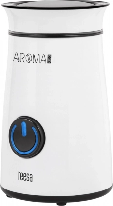 De elektrische koffiemolen TEESA Aroma G50 is een praktische hulp voor liefhebbers van zowel espresso als filterkoffie. Dankzij de krachtige motor en de duurzame roestvrijstalen messen maalt hij koffiebonen snel en gelijkmatig, zodat je drank zijn volle aroma en smaak behoudt. De minimalistische cilindrische vorm met moderne witte afwerking past perfect in elke keuken.
