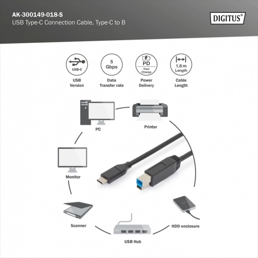 USB‑C naar USB‑B kabel 1,8 m met USB 3.0 SuperSpeed 5 Gbit/s, ondersteuning voor Power Delivery en stroom tot 3 A. Ideaal voor printers, scanners en externe schijven.