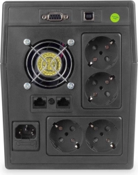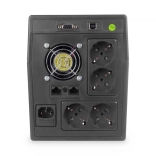Dankzij microprocessorgestuurde regeling biedt de UPS hoge betrouwbaarheid, akoestische alarmen en essentiële beveiligingen: tegen overbelasting, diepontlading en overladen. De functie cold start maakt inschakelen mogelijk zelfs zonder netspanning. Beschikbaar zijn 4 SCHUKO‑contactdozen en USB/RS232 voor beheer, evenals RJ45 voor bescherming van netwerkcommunicatie.