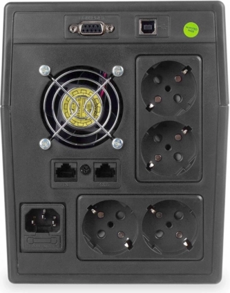 De achterzijde van de UPS is uitgerust met meerdere stopcontacten, communicatiepoorten en een ventilator voor koeling, wat zorgt voor meer connectiviteit en flexibiliteit in gebruik.