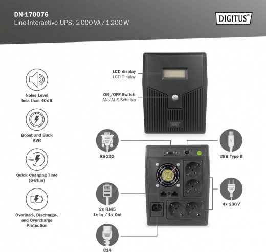 Line-Interactive UPS van Digitus biedt compacte afmetingen en garandeert hoge betrouwbaarheid en prestaties dankzij microprocessorgestuurde regeling. Hij is eenvoudig te bedienen en biedt effectieve bescherming voor thuis- of kantoorsystemen tegen gegevensverlies en -beschadiging.