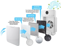 Het drievoudige filter vangt tot 99,97% van onzuiverheden, inclusief allergenen en stof.