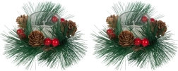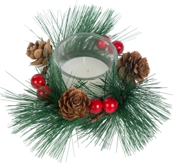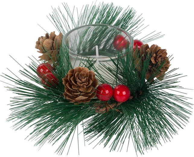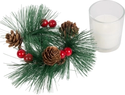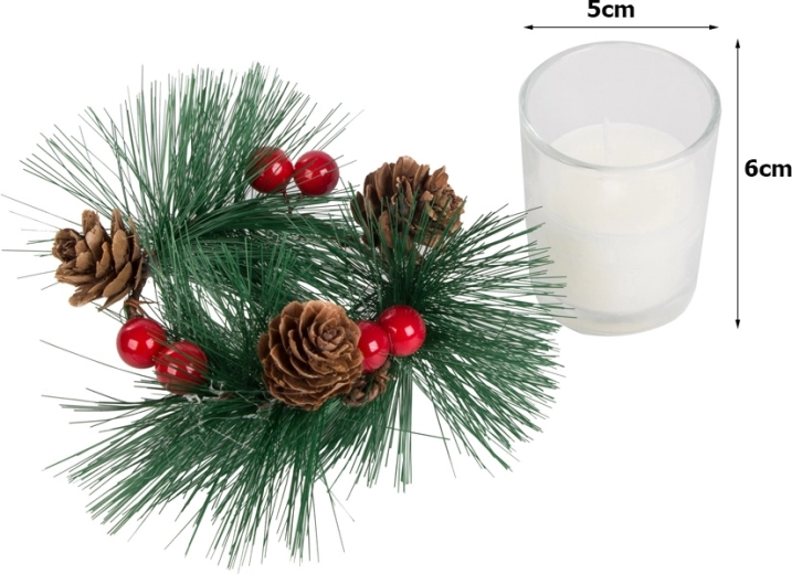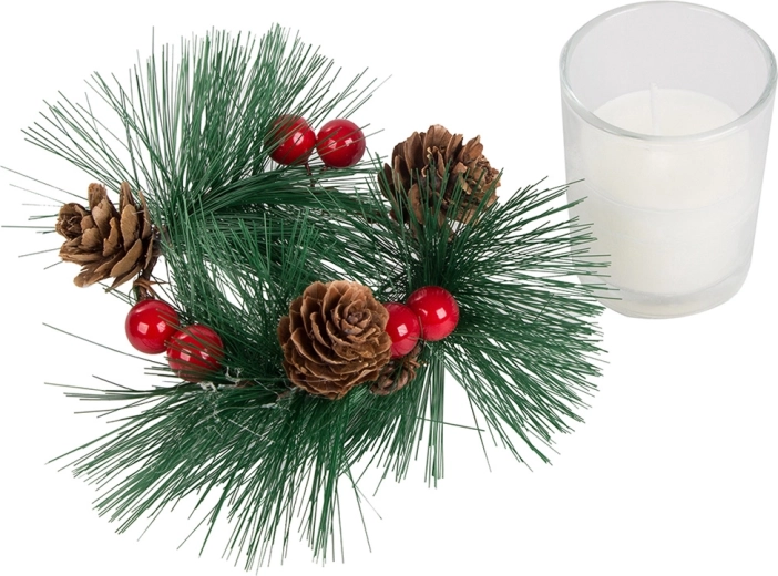 Deze decoratieve kaarsen in de stijl van een kerstkrans zijn de perfecte aanvulling voor uw feestelijke tafel of plank. Dennentakken, dennenappels en rode bessen rond de glazen kandelaar voegen een natuurlijke kerstcharme toe.
