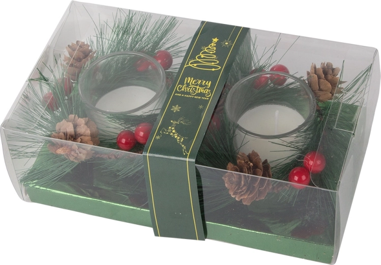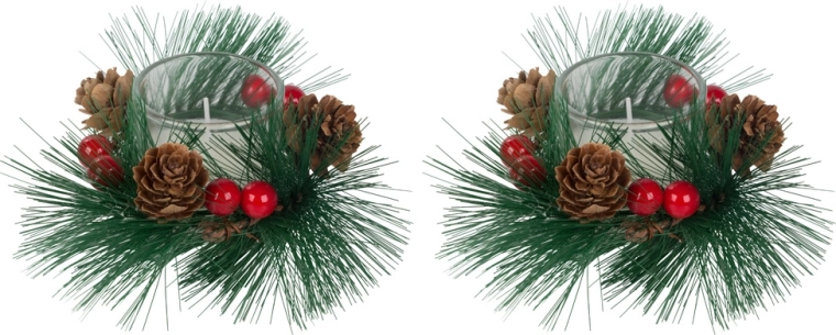 Elegante glazen kandelaars zijn omgeven door kunstmatige elementen die duurzaamheid en langdurige schoonheid garanderen. Perfect voor elk interieur, met een klassiek ontwerp dat bij het winterseizoen past.