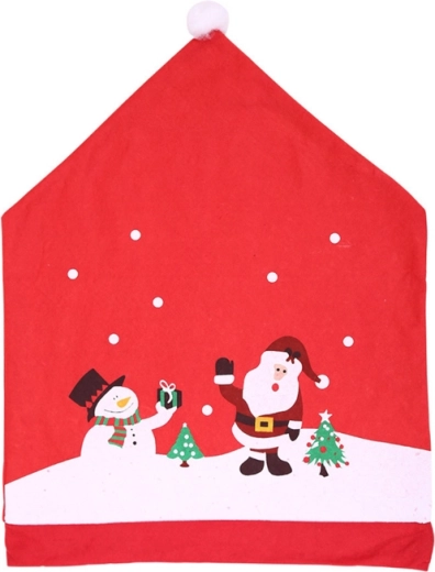 De kerststoelhoes voor de rugleuning verandert elke hoek van je huis in een knusse plek voor feestelijke momenten. De rode stof met print van Santa en een sneeuwpop, sneeuwvlokken en kerstboompjes sluit aan bij traditionele motieven en wordt bovenaan afgewerkt met een zachte pompon zoals op een muts.