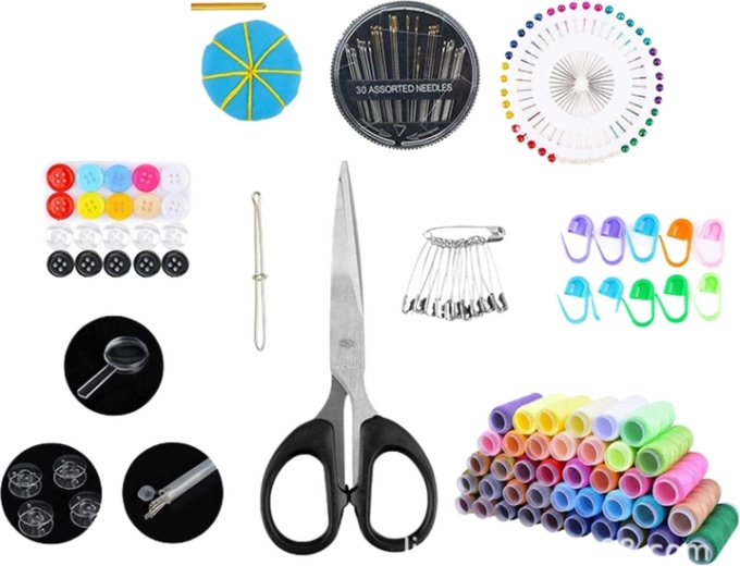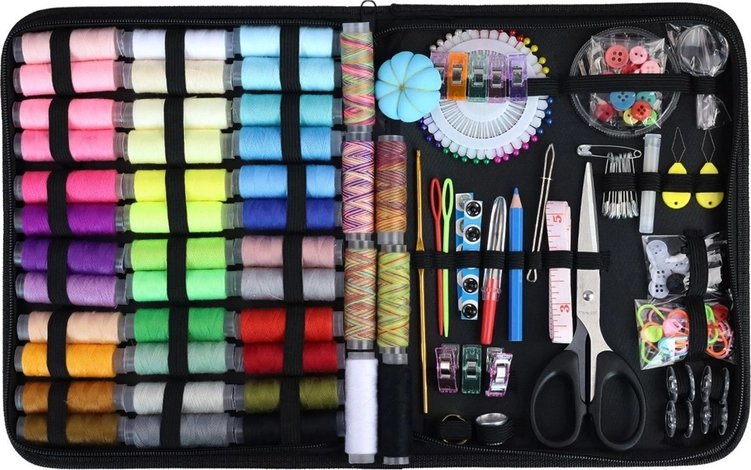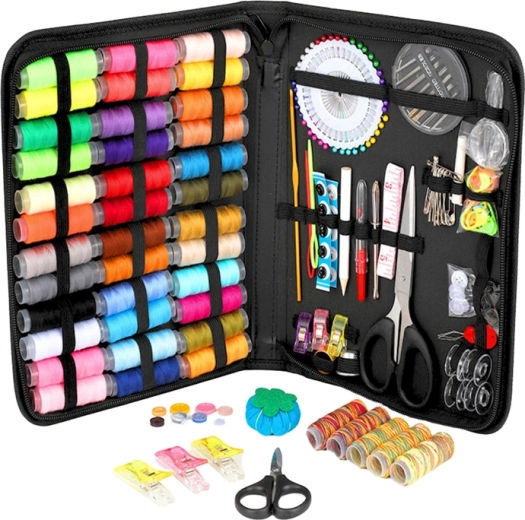 Complete naaikit in een praktische etui biedt alles wat je nodig hebt voor kledingreparaties en creatief naaien. Je vindt hier 43 kleuren en patronen garen, naalden voor diverse materialen, 40 spelden, een kleermakerslint, een markeerpotlood en 15 steekmarkeringen. Ook aanwezig: een tornaaier (naadopener), diverse knopen, een pincet, inrijghulpen, vingerhoeden, een schaar en zelfs een loep voor nauwkeurig werk.