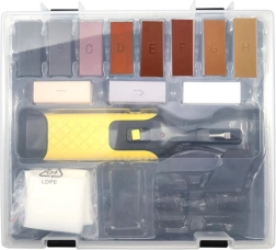Inhoud van de set omvat 11 wassticks, een apparaat voor het smelten van was, een spatel, markers en een praktische verpakking voor eenvoudig opbergen en transport.