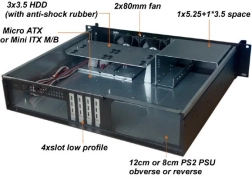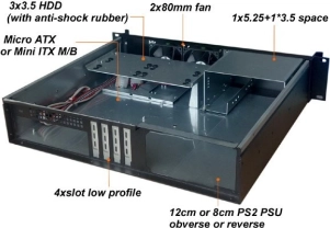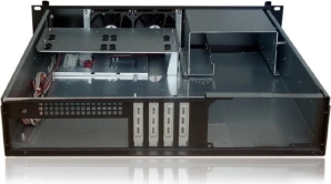 Compacte rack-pc-behuizing voor 19" racks en kasten met een hoogte van slechts 2U, ideaal voor efficiënte plaatsing van servers en thuislabs. Ondersteunt Micro ATX- en Mini ITX-moederborden, biedt eenvoudige montage in een 19" rack, frontpaneel met indicatoren, knoppen en 2× USB, 1× externe 5,25" bay, 4× interne 3,5" bays voor schijven en 2× 80mm frontventilatoren voor betrouwbare koeling.