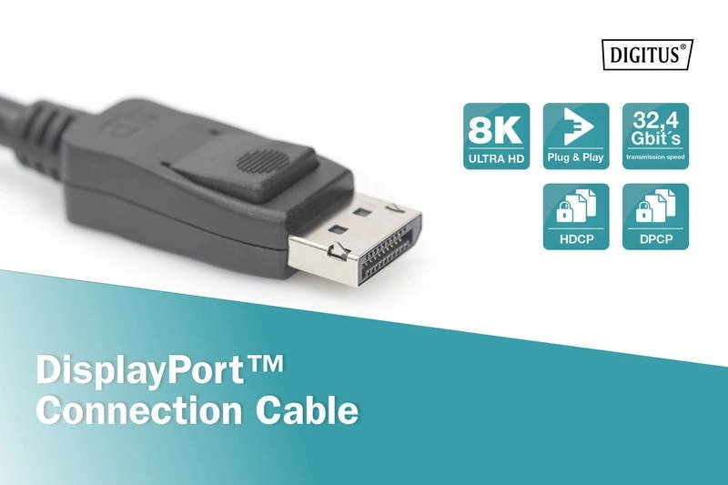 Hoogwaardige DisplayPort-kabel van 2 m voor overdracht van digitale audio- en videosignalen met een resolutie tot 8K. Voorzien van een vergrendeling op de connectoren voor een betrouwbare aansluiting en ideaal voor professioneel werk en veeleisende multimediatoepassingen.