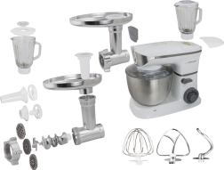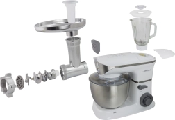 Het bevat een gehaktmolen en blender, wat de mogelijkheden voor het bereiden van gerechten uitbreidt. Het kan romige soepen, gehakte vleesgerechten, ovenschotels, salades, pannenkoeken, muffins, dranken of perfect opgeklopte slagroom aan. Deze multifunctionele robot is een ideale hulp bij het dagelijkse koken en draagt bij aan de bereiding van gezonde en smakelijke gerechten voor het hele gezin.