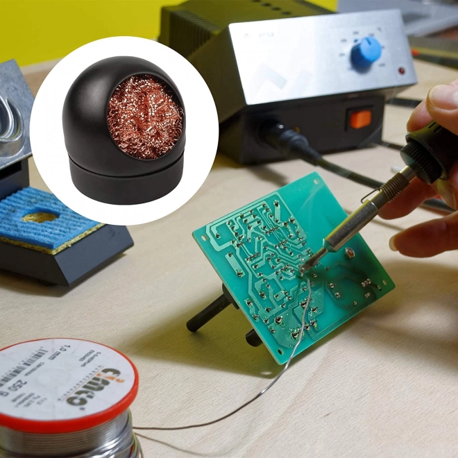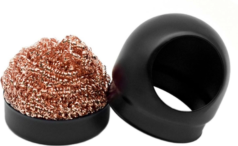 Het reinigingsmiddel bestaat uit twee delen, waarvan het eerste een materiaal van metaalwol is. De soldeerpunt kan op dit materiaal worden afgeveegd om restanten van soldeermateriaal veel efficiënter te verwijderen dan met een standaard spons. De metaalwol zelf wordt geleverd in een compacte afgeronde houder, die helpt ervoor te zorgen dat de puntreiniger praktisch is en de werkruimte niet verstoort.