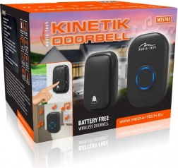 Geen kabels meer of batterijen vervangen. De kinetische deurbel MT5701 gebruikt energie van de mechanische druk op de knop, die wordt omgezet in de elektriciteit die nodig is om het signaal naar de bel in het stopcontact te sturen. Installatie is snel en netjes – plaats de knop bij de deur of poort en steek de ontvanger in het stopcontact.