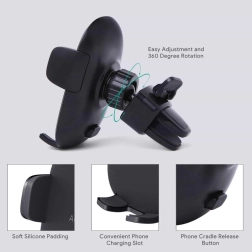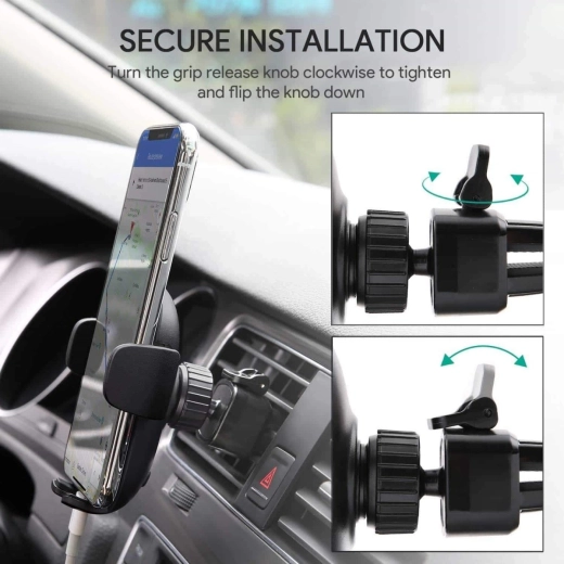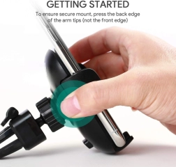 De breed verstelbare klem met snelontgrendelknop maakt razendsnel plaatsen en verwijderen van de telefoon mogelijk. De contactvlakken zijn voorzien van zachte siliconen die trillingen dempen, de telefoon zonder wegglijden vasthouden en hem beschermen tegen krassen. Het bevestigingssysteem is compatibel met de meeste standaard ventilatieroosters – geschikt voor zowel horizontale als verticale lamellen en voor dunnere en dikkere roosters.